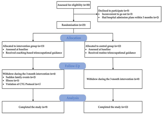 The aim of this pilot study was to investigate the feasibility and effectiveness of a 3-month CTG programme for home-based stroke survivors and their family caregivers. The feasibility objectives were to examine the compliance of participant dyads, the difficulty and suitability of outcome measures, and potential adverse effects. The effectiveness objectives were to explore the effects of CTG in stroke survivors’ participation ability in daily life, IADL, intrinsic motivation, motor function, QoL, caregivers’ perceived benefit, and caregiver-related burden. We hypothesised that the CTG programme would be feasible to conduct and could improve the abovementioned indicators. Additionally, through this pilot study, the authors wanted to provide useful suggestions for future larger randomised controlled trials.