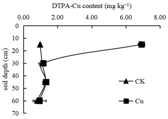 In the absence of Cu application (Figure 1), the available Cu in soil gradually decreased with the soil depth, and it ranged from 0.95 to 1.29 mg kg−1. Under Cu application, the available Cu was significantly higher than in the control. The available Cu in the surface soil increased 6.03-fold compared with the control, and the available Cu was maintained between 6 and 7 mg kg−1. Another enrichment of Cu was most pronounced in the 30 cm soil layer. Cu easily precipitates with carbonates and bicarbonates in calcareous soil; in addition, Cu easily forms complexes with organic matter, which can impede its specific adsorption. Therefore, Cu does not easily migrate in soils and can easily become enriched, which affects its availability [12]. The distribution of the available Cu in this study could reflect the above chemical characteristics of Cu.
