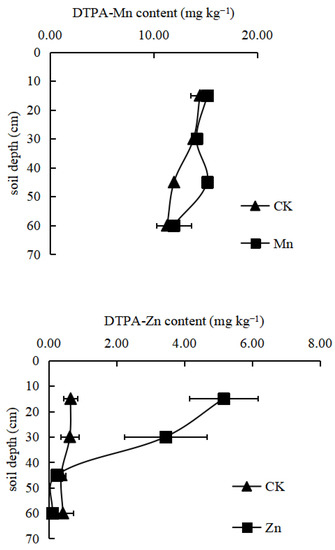 The effects of micronutrient fertilizer application on soil-available Zn were similar in the control and experimental groups (Figure 2). The available Zn showed an S-curve pattern in the soil layers. The application of Cu and Mn increased soil-available Zn in the surface soil and 30–45 cm soil layer. These results indicate that Cu and Mn application did not consistently inhibit Zn in the soils. Millikan showed that the Zn concentration in subterranean clover and alfalfa was not affected when Cu was deficient [30]. This study also showed that Cu did not show inhibitory effects on Zn.