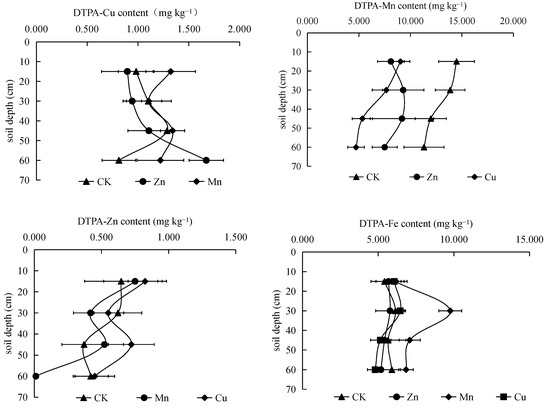 In the absence of fertilizer application, soil-available Mn decreased linearly with the soil depths (Figure 2). After the application of Zn and Cu, soil-available Mn also decreased linearly with the soil depths, but the decreases were all lower than the control. These results indicate that Zn and Cu fertilizers did not promote the accumulation of soil-available Mn. Chen et al. showed that there was an antagonistic relationship between Zn and Mn, which is consistent with the results of this study [29]. In addition to this, the results showed that the Cu fertilizer could not promote soil-available Mn. It has been described above that Mn fertilizer also did not significantly promote available Mn. Thus, we can conclude that the micronutrient fertilizers were not conducive to the increase in available Mn in the calcareous soils of the Loess Plateau.