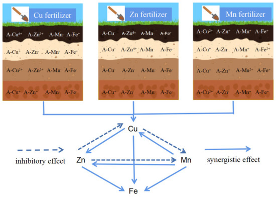 Interactions among Cu, Mn, Zn and Fe. A- represents the available state of micronutrients; + represents the increase in the available micronutrient; —represents the decrease in the available micronutrients; the numbers 6+, 2+ and 4+ represent the increase in the degree of the available micronutrients—the larger the number, the higher the increase.