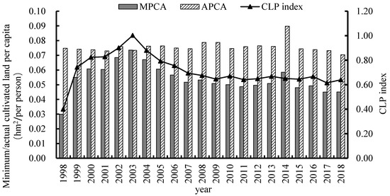 - The minimum per capita cultivated land area (MPCA) refers to the cultivated land area that can meet people’s normal food needs under the regional food productivity level and supply capacity, which takes into account the linkage between cultivated land and other factors [45]. In any country, changes in cultivated land are inevitable with industrialization and urbanization. When the actual per capita cultivated land area (ACPA) in a region is lower than the MPCA, it will endanger basic food security. The formula is: