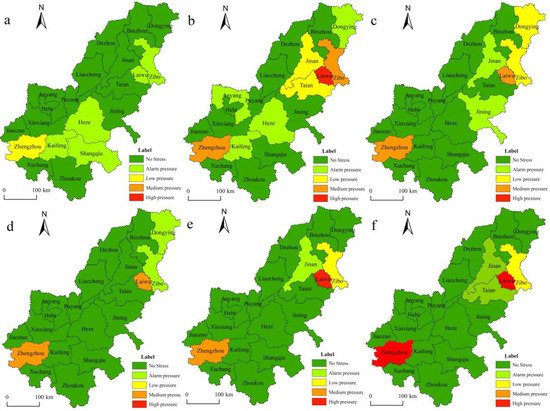From Figure 3, it can be seen that the CLP in the AALYR presents a spatial distribution pattern of “overall stability and local changes”. From 1998 to 2018, the CLP in most prefecture-level cities in the AALYR was at the no pressure level and only a few prefecture-level cities were above the low-pressure level. The CLP was significantly reduced and the food security was effectively guaranteed. In 1998, the CLP level in the AALYR was low; from 2002 to 2006, the CLP changed significantly due to the low-temperature freezing and drought disasters; from 2006 to 2010, the CLP level in Jinan, Jining, Dongying and Zibo showed a downward trend; from 2010 to 2018, except for Zhengzhou, Laiwu and Zibo, the CLP in other cities was at the level of alarm pressure or no pressure.