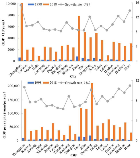 As a major agricultural region in China, the AALYR grow not only grain crops such as wheat, corn and soybeans, but also economic crops such as cotton, oil and tubers. According to statistical data (Figure 4), the economy in the AALYR has developed rapidly in recent years. In 1998, the GDP was 616.638 billion yuan and the per capita GDP was 6181.5 yuan/person. In 2018, the GDP reached 6877.69 billion yuan and the per capita GDP was 57,300 yuan/person. From 1998 to 2018, the GDP growth rate in the AALYR was 10.5% and there was a large difference in economic scale among cities. In 2018, the smallest regional GDP was held by Hebi with a value of 86.19 billion yuan, while the largest, Zhengzhou had a value of 1014.33 billion yuan, 11.77 times that of Hebi. In 2018, the per capita GDP of Dongying was the largest, with 211,000 yuan, while that of Zhoukou was the smallest, with 21,000 yuan. The per capita GDP of Dongying was about 10 times that of Zhoukou. By the end of 2018, the primary industry in the AALYR accounted for 7.3% of the area’s GDP and the secondary industry accounted for 46.1% of GDP. With the continuous improvement of economic development levels, the entertainment and service industries were booming, exceeding the proportion of the secondary industry. In 2018, the tertiary industry accounted for 46.6% of GDP; therefore, the secondary and tertiary industries were dominant.