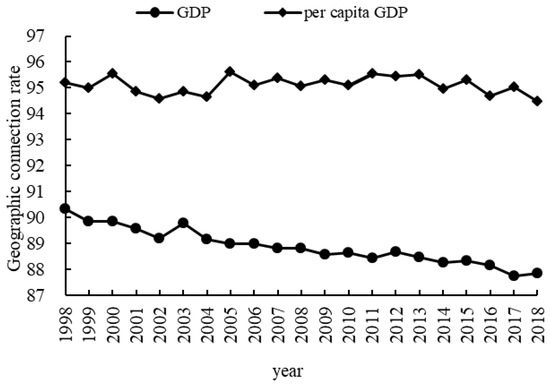 The geographical connection rate can effectively measure the spatial distribution relationship between CLP and the economy in the cities in the AALYR from 1998 to 2018. As can be seen from Figure 5, the geographic connection rates of GDP and per capita GDP in YYLAR regions were greater than 87 (the highest value being 96) and showed a decreasing trend, with GDP decreasing at a faster rate. This implied that the trends of GDP and per capita GDP were basically consistent. Overall, there was still a large variability in their trends at different stages during the study period.