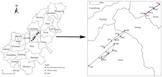 To further reveal the coupling relationship between the CLP and economic development, the geographical concentration and coupling index of CLP, GDP and per capita GDP of 20 cities in the AALYR were calculated by Formula (6). We found geographical variability in the coupling relationship between cultivated land pressure and economic development. Table 1 shows that, from 1998 to 2018, according to the geographical concentration of CLP, peak areas appeared in Laiwu, Hebi, Jiaozuo, Zhengzhou and Zibo. The low-value areas were Dezhou, Zhoukou and Shangqiu. From the perspective of economic geographical concentration, high-value areas appeared in Laiwu, Zibo, Jiaozuo and Zhengzhou and the gap between the highest and the lowest value was significant, indicating significant differences in regional economic development. Regarding the coupling index of CLP and the economy, the indexes of Laiwu, Hebi and Zhengzhou were higher, indicating that the growth of regional CLP had a closer relationship with economic growth in recent years and that economic development affected the level of CLP. The coupling indexes of Jinan and Dongying were low and the CLP lagged behind their economic development, indicating that the growth rate of CLP brought by the economic growth of the two cities was lower than that of other cities.