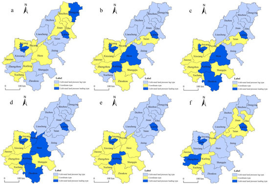 From the perspective of the spatial coupling type, most regions of the AALYR showed a decoupling trend between economic growth and CLP. Among them, in 1998, there were eight cities with CLP lagging behind economic development, namely Dezhou, Tai’an, Liaocheng, Jining, Xinxiang, Zhengzhou, Zhoukou and Shangqiu; here, the impact of economic development on changes in CLP was small. From 1998 to 2014, these cities changed from the lagging type to the coupling and coordination types. By 2018, the number of cities of this type had increased, indicating that the regional pressure on cultivated land was low, the level of economic development was high and that economic development was less affected by the CLP. However, the development of the cities coordinated by CLP and economic development was relatively stable, with a high degree of coupling between the two, showing a good interactive relationship. From 1998 to 2014, this type of city was concentrated and located in Henan Province, indicating that the CLP and economic development were gradually balanced in this province. By 2018, the number of cities with coupling coordination between CLP and economic development decreased from nine in 2014 to seven, most of which were located in the southwest. The number of prefecture-level cities whose CLP was ahead of economic development increased from three in 1998 to six in 2010. By 2018, only Zhengzhou, Laiwu and Hebi were ahead of the economic development cities. Overall, the impact of regional economic growth on the CLP has been gradually decreasing, as is the number of cities with leading pressure on cultivated land. However, the CLP and economic development in some cities show a relatively high coupling degree. In the long run, it is thus necessary to further strengthen the construction of high standard cultivated land, actively develop the ecological agriculture, improve the level of food output and prevent problems such as an insufficient food supply and unreasonable use of cultivated land resources caused by the excessive CLP.