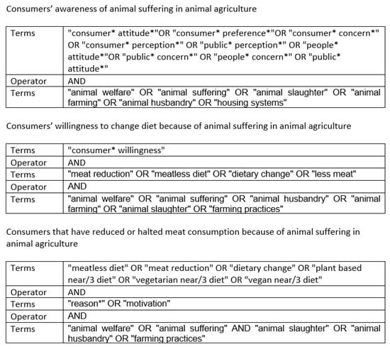 This systematic review followed the PRISMA 2009 (Preferred Reporting Items for Systematic Reviews and Meta-Analyses) protocol [85]. Based on previous scientific knowledge on the topic of animal welfare and after conducting preliminary searches on Google Scholar, we identified a series of keywords to search for literature on consumers’ attitudes towards animal welfare or suffering in the context of animal agriculture. We conducted three queries in the Web of Science (WOS) Core Collection in May 2022. The first aimed to find studies on people’s awareness and other attitudes regarding animal farming practices, animal characteristics, animal transportation, and slaughter; the second looked for papers reporting consumers’ willingness to reduce meat consumption because of animal suffering; and the third searched for literature on actual dietary change motivated by animal welfare. Search strings for each query can be found in Figure 1.