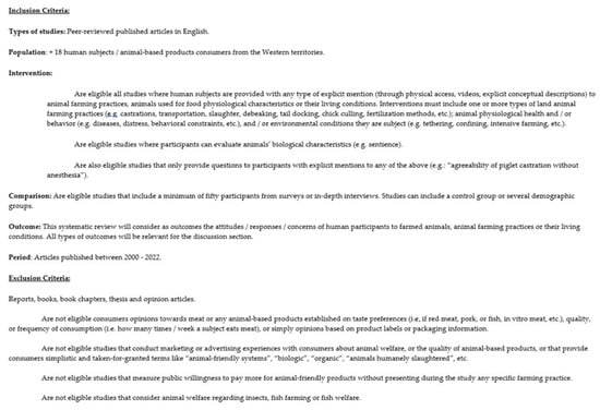 The eligibility criteria for this systematic review appears in detail in Figure 2. The principles that support our eligibility criteria are the following: (1) Studies must either provide participants, prior to experiments, with explicit information (pictures, videos or written information) about animals’ living conditions, the practices to which they are subject, their characteristics and their suffering; or (2) Studies pose questions to find out consumers’ awareness of, or agreeability to, animals’ sentience (animals’ biological and psychological characteristics), their living conditions, or farming practices. The reason for (1) is that only by providing reliable information about animals’ characteristics, their living conditions, and the practices to which they are subject can consumers truly understand the object of inquiry, i.e., animal suffering/welfare. The reason for (2) is that only by knowing consumers’ awareness of animal suffering and/or their understanding of animal biological and psychological characteristics is it possible to evaluate consumers’ attitudes and behavior towards reducing meat intake. In other words, attitudes in general, and willingness to limit meat consumption and actual dietary change, in particular, may depend on the type of information (vague and general vs. concrete and explicit) to which consumers are exposed.