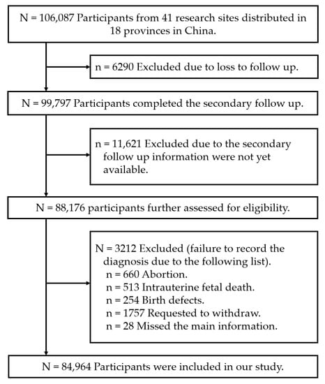 Flowchart of study enrolment, with the participants selected from 41 research sites distributed in 18 provinces or municipalities during November 2017 to December 2020 (n = 84,964).