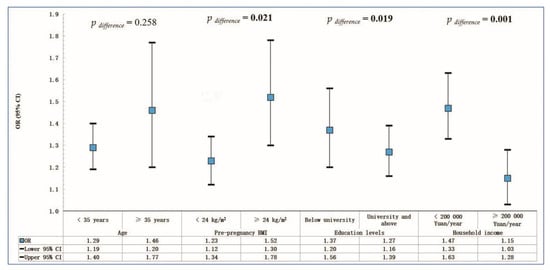 Stratified analyses were conducted to explore the potential effects of age (≥35 and <35 years), overweight or obesity (pre-pregnancy BMI < 24 and ≥24 kg/m2), education levels (below university and university and above), and household income (CNY <200,000 and ≥200,000/year). The analysis was repeated for each sub-group, after which p values for group differences were calculated by a two-sample t-test.