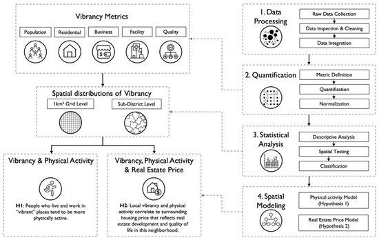 Investigating the complex relationship between vibrancy and physical activity provides critical insights for planning healthy and active cities [15]. Unfortunately, there is a limited understanding of such complex relationships, mainly due to three obstacles. First, it is difficult to define, observe, quantify, and analyze local vibrancy with data at a much finer spatial resolution. Such a localized vibrancy measure requires proper quantification, normalization, and standardization. Furthermore, it is challenging to integrate data representing physical activity and analyze their behavioral patterns along with localized vibrancy in a spatial model. Finally, it is necessary to investigate the complex interaction between vibrancy and physical activity within specific socioeconomic contexts, since their intra-city variation can be related to different levels of neighborhood development. In summary, the potential value of the vibrancy measure still needs a complete analytical framework that integrates potential implementation for promoting active living [16].