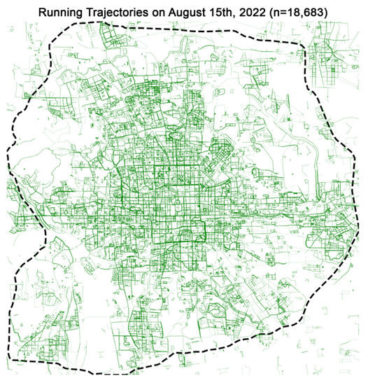 Visualization of extracted daily running trajectories (n = 18,683) data within Beijing’s sixth ring road on 15 August 2022.