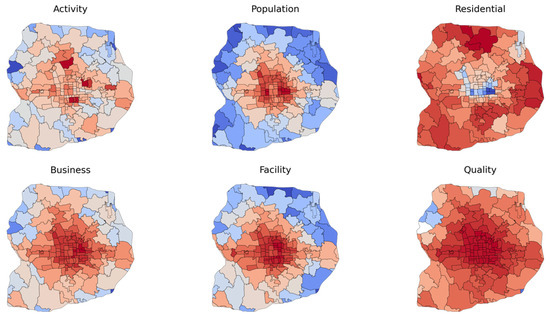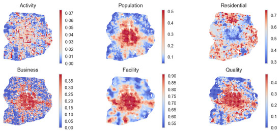 The spatial distribution of vibrancy measures indicates the impact of the monocentric urban form of Beijing and resonates with previous research findings (Figure 3). The correlation matrix of normalized metrics reveals underlying interactions among different aspects of vibrancy. The results show that most metrics have a positive correlation coefficient with each other, indicating that they have synergy rather than conflicts when driving local vibrancy. Such results resonate with Jacob’s observation of urban vibrancy that different elements compose local vibrancy and conduct the “daily ballet” on the streets [17]. Locations with high residential concentration are not “vibrant” based on vibrancy metrics, so we may need to separate the residential and non-residential areas in a city when interpreting vibrancy. Correlation coefficients among vibrancy indicators show that community facilities (educational, cultural, healthcare, sports, and grocery facilities) and public space quality (streetscape quality and green space) are mostly correlated (coefficient = 0.7). Global Moran’s I statistics indicate that these indicators are not distributed randomly but with different levels of spatial autocorrelation, reflecting Tobler’s First Law of Geography. The spatial statistics show that all vibrancy indicators are spatially correlated (p-values < 0.0) with a different positive Moran’s I value. Precisely, different levels of spatial autocorrelation follow the order of community facility (0.973), population (0.950), residential (0.818), public space quality (0.811), and local business (0.612). The population and community facility indicators have a Moran’s I value close to 1, indicating the strong spatial clustering effects of these two factors in Beijing. In contrast, Moran’s I value for localized physical activity is 0.407, indicating that physical activeness is not randomly dispersed but without a strong clustering effect compared to vibrancy.