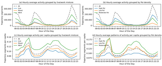Time series of average hourly patterns of physical activity grouped by live/work mix and PoI density.