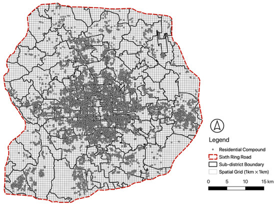 Real estate compounds (n = 6678) within sixth ring road in Beijing with the spatial grid (n = 9251) and sub-districts (n = 167).
