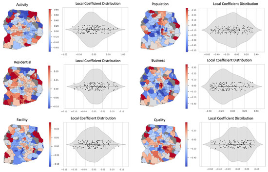 The results from a GWR model reveal how different indicators collectively drive local vibrancy and their interactions based on geography. As Table 3 shows, the GWR model performs better than a regular multivariate regression model according to R-squared values and Akaike Information Criterion (AIC). While the global regression model’s results indicate how base population, community facility, and public space quality collectively drive local physical activity, the GWR model reveals the local variation of each variable’s estimated coefficient. The optimal bandwidth for GWR spatial kernel is 720 m, indicating that vibrancy factors may interact differently depending on specific locations. Both models’ results show no consistent effect of local business (measured by PoI) on physical activity, indicating no strong spatial correlation between these two vibrancy factors. A simple GWR linear model further proves that although there is a positive correlation (p-value = 0.000), local business has little explanatory power for estimating physical activity (adjusted R-squared value = 0.026). Such results indicate that local business as a common measure for vibrancy does not correlate to physical activity.