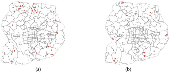 The final dataset includes a total of 6678 residential apartment compounds within the sixth ring roads of Beijing (Figure 6). The spatial distribution of these properties reflects rapid real estate development in the last three decades. From the 1990s to the 2000s, the city experienced the highest annual expansion rate (58.91 sq. km. per year) and rapid urban sprawl along with fast-growing private vehicle ownership and the expansion of the subway, light rail, highways, and the ring road system [76,77,78]. During this period, most new neighborhoods were shaped by real estate development dominated by large-scale gated residential apartment compounds within the city [79]. At the same time, new neighborhoods emerged on the city’s outskirts, representing a suburban lifestyle with luxury townhouses and villas [80]. An integrated model with residential apartment compounds’ information reveals the current spatial distribution of real estate properties and their local characteristics (Table 4). All selected independent variables are statistically significant at various levels, but the model’s R-squared value indicates a relatively poor overall fit (R-squared value = 0.595). The global estimated coefficients also show counterintuitive results, such as the building age (coefficient = 0.045, p-value < 0.0001) and public space quality (coefficient = −0.022, p-value < 0.1). The GWR model performs better than a regular regression model according to the R-squared values and AIC scores. The estimated local coefficients show the spatial heterogeneity of different factors related to local residential apartment prices.