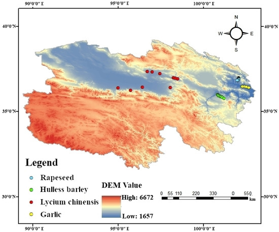 In order to gain a comprehensive understanding of the quality of water bodies in the production areas of special crops in Qinghai Province, we collected seven, four, nine and six surface water samples from the production areas of rape, garlic, lycium chinensis and hulless barley, respectively. The above mentioned, currently used pesticides, typical organochlorine pesticides used historically, as well as pH, COD and soil nitrogen and phosphorus were all tested for. The distribution of the specific sampling points is shown in Figure 1.