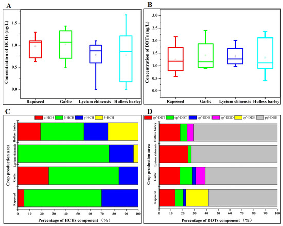 Residue status of organochlorine pesticides (HCHs and DDTs) in surface water samples from four typical crop areas. (A) Residue Levels of HCHs; (B) Residue Levels of DDTs; (C) Residue composition of HCHs; (D) Residue composition of DDTs.