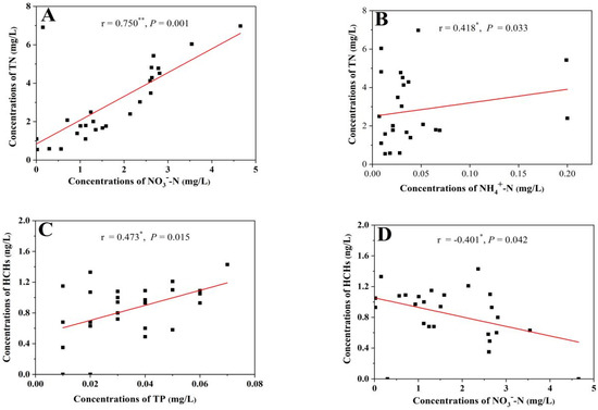 Correlation analysis of physicochemical indices and residues of HCHs in surface water samples from four typical crop-producing areas: (A) extremely positive correlation between the total nitrogen concentration and the nitrate concentration; (B) positive correlation between the total nitrogen concentration and the ammonium concentration; (C) negative correlation between the residues of HCHs and the nitrate concentration; (D) positive correlation between the residues of HCHs and the total P.