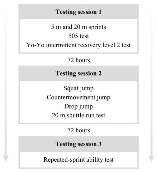A cross-sectional correlation analysis study was used to investigate the association between performance in the YYIR2 and performance in other field tests in soccer players. Participants were tested at the beginning of the preseason for three days, with 72 h of non-testing between each session (Figure 1). All tests were performed indoors and at the same time of day. A 15-min warm-up consisting of low-intensity jogging, dynamic stretching, running drills, and task-specific high-intensity activity was completed before the tests. The participants were allowed to perform low-intensity physical activity between the testing days.