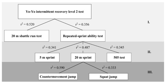 To our knowledge, this is the first study evaluating the relationship between performance in the YYIR2 and performance in field tests of aerobic endurance, repeated-sprint ability, linear speed, change-of-direction speed, and jump performance in male soccer players. The aim was to propose a three-level model of the factors contributing to YYIR2 performance. The obtained results provide a picture of the integral character of YYIR2 performance and its gradual construction. We conducted research on soccer players from the third-best Slovakian soccer league. Therefore, further studies aimed at creating a similar model of the factors contributing to YYIR2 performance, carried out on top-class players, would be beneficial.