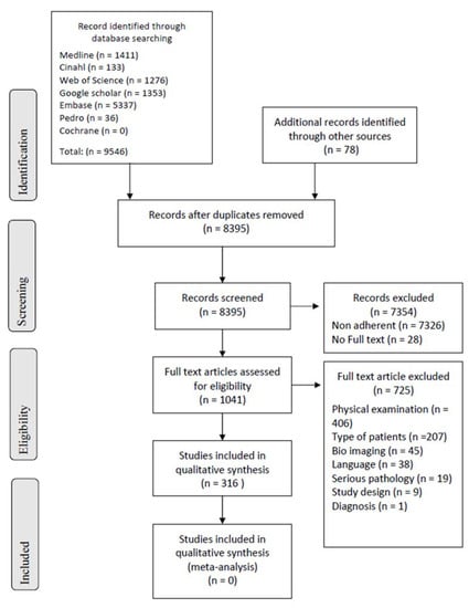 - Maselli, F.; Palladino, M.; Barbari, V.; Storari, L.; Rossettini, G.; Testa, M. The diagnostic value of Red Flags in thoracolumbar pain: A systematic review. Disabil. Rehabil. 2020, 44, 1190–1206. [Google Scholar] [CrossRef]