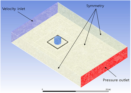 ANSYS SpaceClaim 19.1 and Design Modeler 19.1 (ANSYS, Inc. San Jose, CA, USA) were used to generate the geometry of the storage facility and dike. In the simulation for comparison with the experiment, the size of the entire analysis area was set to 3 m in width × 3 m in length × 1.5 m in height, and the storage facility and dike were created at the center of the width and length. The simulation was performed using the same conditions as the experiment except for the size and the contents. The dike and the external boundary were set as walls and the rest were all set as interiors. The geometric model and boundary conditions of the square bund are shown in Figure 2. The size of the entire analysis area was set to 75 m in width × 50 m in length × 12.5 m in height, and the storage facility and dike were created considering the directions of the wind blowing in and out [23]. In the simulation, it was assumed that the storage facility was installed outside the building, so the effect of wind was considered. Considering atmospheric conditions, the velocity inlet and pressure outlet were set, and both sides and the upper part were set symmetrically. In addition, the dike and the floor were set as walls, and the storage facilities were set as internal conditions.