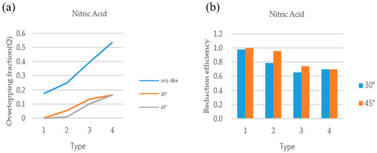 (a) Analysis of nitric acid overtopping fraction, and (b) reduction efficiency of nitric acid with deflector plates (30°, 45°) in the dike.