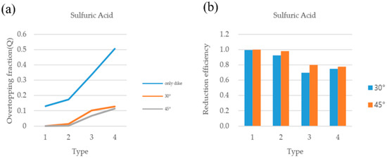 (a) Analysis of sulfuric acid overtopping fraction, and (b) reduction efficiency of HNO3 with deflector plates (30°, 45°) in the dike.
