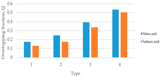 - In all types of dikes in this study, nitric acid exhibited overtopping phenomena that was up to about 7% higher than sulfuric acid, indicating that the density and viscosity of the material affected the overtopping fractions over time, although the differences were not large.