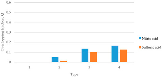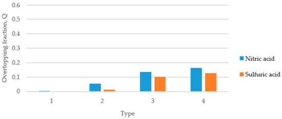 Figure 5 shows the results of calculating the overtopping fractions when there are no deflector plates in the dike. Depending on the installation of deflector plates, a difference of up to 7% occurred in the overtopping. Additionally, nitric acid is more likely to cause overtopping of the dike than sulfuric acid, indicating that density and viscosity have a slight effect on overtopping over time. In Figure 5, Figure 6 and Figure 7, the overtopping fracture was analyzed by changing the angle of the dike without installing deflector plates. The overtopping fracture in Type 1 was the least, and the value of nitric acid was higher than that of sulfuric acid in all types. The installation of the dike at an angle of 30 degrees may help prevent overtopping, but the effect of the angle was not significant.