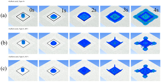 Sulfuric acid overtopping phenomena of the Type 4 dike according to time (0~4 s). (a) Dike without deflector plates, (b) dike with deflector plates with 30° angle, and (c) dike with deflector plates with 45° angle.