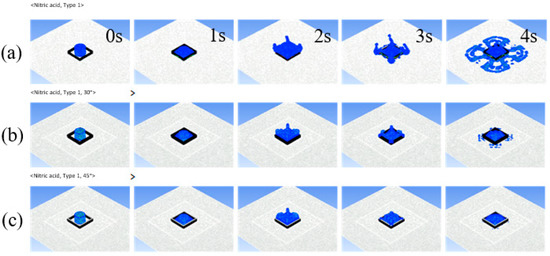 Nitric acid overtopping phenomena of the type 1 dike according to time (0~4 s). (a) Dike without deflector plates, (b) dike with deflector plates with 30° angle, and (c) dike with deflector plates with 45° angle.