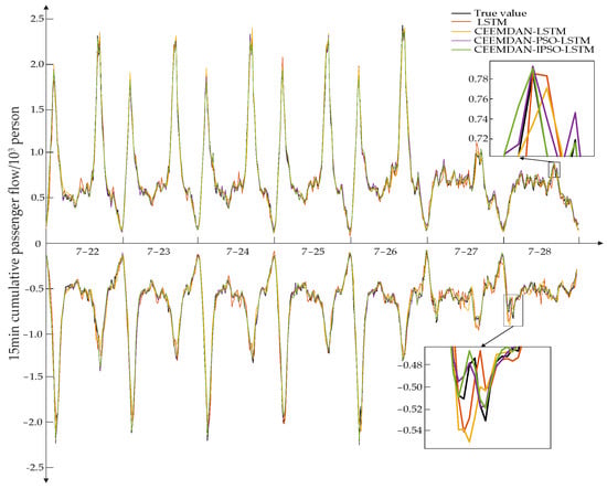 Figure 8, the comprehensive ranking of prediction results is as follows: LSTM < EMD-LSTM < EEMD-LSTM < CEEMD-LSTM < CEEMDAN-LSTM < EMD-PSO-LSTM < EEMD-PSO-LSTM < CEEMD-PSO-LSTM < CEEMDAN-PSO-LSTM < EMD-IPSO-LSTM < EEMD-IPSO-LSTM < CEEMD-IPSO-LSTM < CEEMDAN-IPSO-LSTM. Among the peer models, the CEEMDAN-IPSO-LSTM model has the highest accuracy and can meet the demands for accurate short-term predictions of passenger flow.