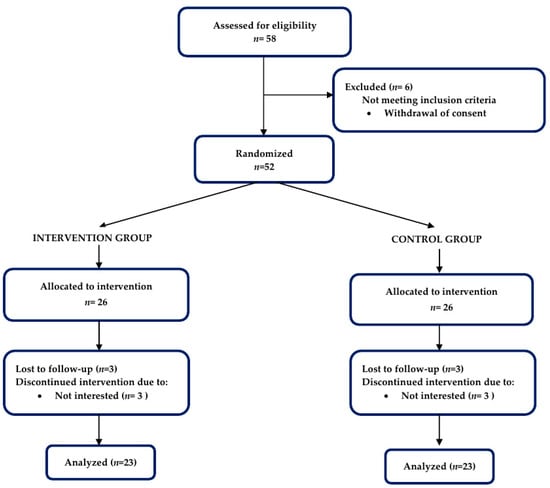 The sample size was calculated using G*Power 3.1.9.2. [19]. Previous nutritional intervention studies with a similar outcome variable (angular velocity of 60°/s measured by the Biodex) were used to estimate the sample size. We derived a small-to-medium effect size of intervention from these studies (Cohen’s f = 0.29). Thus, with a statistical power of 0.80, probability level of 0.05, and effect size of 0.20, a sample size of 45 participants was deemed necessary to achieve sufficient power. Considering a 30% dropout, we recruited a total of 52 participants and randomly allocated them into two groups (n = 26 in each group): (1) intervention and (ii) control. Figure 1 describes the study design, with participant recruitment and exclusion criteria. The study procedures were approved by the Research Ethics Committee of Kyungsung University (IRB NO. KSU-21-03-004, 17 June 2021).