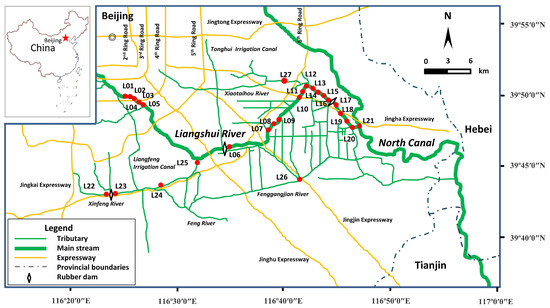 Liangshui River (LSR) is the second largest drainage river in Beijing. It rises in the outlet of the sewage treatment plant (STP) of the steel plant of Beijing, and flows southeast into the North Canal main stream through Fengtai, Daxing, and Tongzhou Districts. It stretches 68 km with a basin extending over 600 square kilometers. There are more than one thousand drain outlets along the river banks, 70% of which work all the year round. Annually, LSR receives about three hundred million tons of treated or untreated domestic sewage and industrial effluent, accounting for 20% of the total discharge in Beijing’s central region. The regulation projects of LSR have been carried out by the Beijing government since the early 1990s, including controlling pollution sources, building or expanding wastewater treatment plants (WWTP) and promoting sewage pipe network management, and the water quality was therefore improved in the early years. However, due to the rapid population growth, the decreasing precipitation, the lag in the WWTP expansion and the insufficient sewage interception and treatment capacities, LSR was subjected to severe pollution.