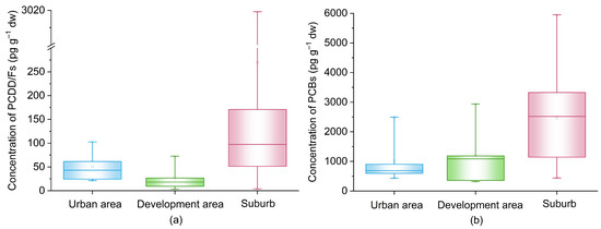The concentration distribution of PCBs in the three functional urban areas is given in Figure 2. In general, the spatial distribution was similar to that of PCDD/Fs. The PCB levels in the urban area and development area were lower than those in the suburbs. In the urban area, the average concentration was 1023 pg g−1 dw and the highest level was detected in L02 (2492 pg g−1 dw). At the sites of L06 and L22–L25 in the Yizhuang Economic Technological Development Area, the mean level was 1177 pg g−1 dw, which was slightly higher than that of the urban sites. The PCB level in the suburbs was 2463 pg g−1 dw on average and showed the same increasing trend as PCDD/Fs. This trend revealed a great contribution of heavy industrial activities in the Beijing chemical industry park and the Tongzhou industrial cluster.