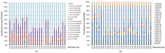 Percentage composition of PCDD/F (a) and PCB (b) congeners in the sediments from LSR.