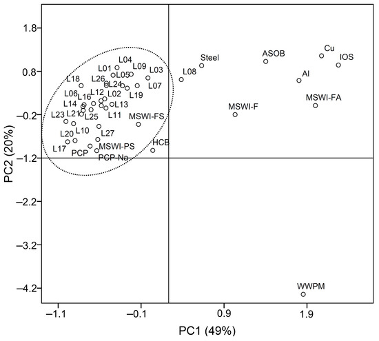 Principal component analysis (PCA) score plot of the 2,3,7,8-substituted PCDD/F congeners in the sediments of LSR and the samples from the typical sources. Abbreviations: PCP, pentachlorophenol [44]; PCP-Na, sodium pentachlorophenate [44]; STEEL, ambient air around a steel plant [45]; Al, gaseous emission from secondary Al metallurgy [20]; Cu, gaseous emission from secondary Cu metallurgy [20]; IOS, gaseous emission from iron ore sintering plants [20]; MSWI-FS, fluvo-aquic soil near to a municipal solid waste incineration (MSWI) plant [46]; MSWI-PS, paddy soil near to a MSWI plant [46]; MSWI-F, flue gas from an MSWI plant [46]; MSWI-FA, fly ash from a MSWI plant [46]; WWPM, waste water from a pulp mill [47]; HCB, housecoal burning [48]; ASOB, agricultural straw open burning [49].