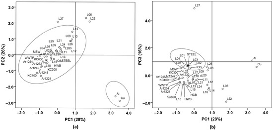 PCA score plot of the dioxin-like PCB (dl-PCB) congeners in the sediments of LSR and the samples from the typical sources; (a) PC1 and PC2 score plot; (b), PC1 and PC3 score plot. Abbreviations: HCB, housecoal burning [48]; HWB, hardwood burning [48]; KC, brand name of commercial PCB formulations, Kanechlor [51]; Ar, brand name of commercial PCB formulations, Aroclor [52]; Al, gaseous emission from secondary Al metallurgy [20]; Cu, gaseous emission from secondary Cu metallurgy [20]; IOS, gaseous emission from iron ore sintering plants [20]; WWTP, sewage sludge of urban wastewater treatment plants [39]; STEEL, ambient air around a steel plant [45]; MSW, municipal solid waste [53].