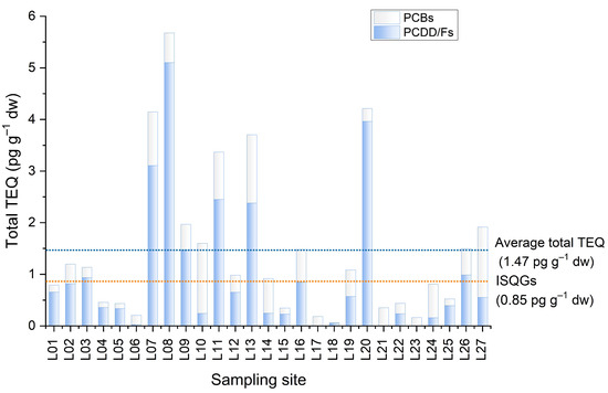 Sediments provide the natural habitat for aquatic organisms. Acting as the important sinks and repositories of POP cycling, sediments subsequently become a main source of these pollutants in the environment. Due to their high toxicity and great chemical stability, PCDD/Fs and PCBs in sediments may pose long-term exposer risks to aquatic ecosystems and human health. In this study, the toxicity of sediments was estimated by the TEQs calculated using toxic equivalent factors to 2,3,7,8-TCDD. Sediment quality guidelines (SQGs) derived by the Canadian Council of Ministers of the Environment (CCME) [54] were used to identify and evaluate the ecotoxicological risks of PCDD/Fs and PCBs in the sediments from LSR. The guidelines define two ranges of concentrations expressed on a TEQ basis and adjusted by a safety factor of 10: interim sediment quality guidelines (ISQGs) of 0.85 pg TEQ g−1 dw, below which the incidence of adverse biological effects rarely occur, and the probable effect level (PEL) of 21.5 pg TEQ g−1 dw, above which adverse effects are expected to occur frequently. The TEQ levels presented in the guidelines include concentrations of 2,3,7,8-substituted PCDD/Fs and coplanar PCBs. Figure 6 showed the ISQGs and the total TEQ (the sum TEQ levels of PCDD/Fs and PCBs) in our study. The spatial distribution of the TEQ levels showed site-specific characteristics. Relatively higher TEQ levels were found in the downstream sediments than those in the upstream sediments. The top five values were all from the downstream sediments. As mentioned above, the downstream area of LSR was subject to multidisciplinary industrial effluent discharge and low capacity of wastewater treatment. The results of TEQ levels and spatial distribution (Figure 6 and Figure 2) indicate that industrial inputs were the main sources of PCDD/Fs and PCBs.