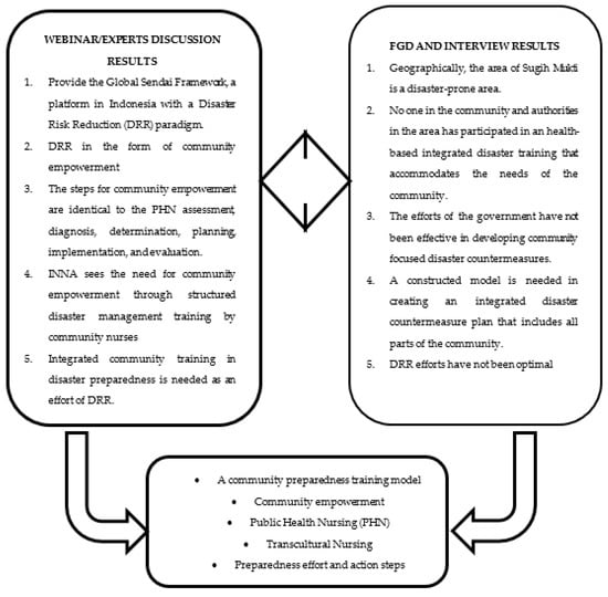 The initial stage of the research began with expert discussions and national seminars with four key informants from BNPB, PPKK-Kemenkes, PPNI, and academics of disaster nursing experts. The results of expert discussions and seminars were identified as central themes in the development of a culturally sensitive Public Health Nursing (PHN)-based disaster risk-reduction preparedness training model. The resulting research themes are as follows.