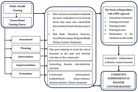 The study findings highlight the importance to the community of the Disaster Risk-Reduction Preparedness Model Based on Culturally Sensitive Public Health Nursing. The community is approached using a combination of the Public Health Nursing (PHN) and Transcultural Nursing principles. An integrated model for disaster preparedness training based on public healthcare as a solution to empower communities in managing disaster risk is validated, constructed, and designed. This model consists of five main components: nursing care assessment instruments and introductory surveys for disaster-prone communities; public health nursing-based disaster preparedness training integration curriculum; public health nursing-based disaster preparedness training module integration training process; public health nursing-based disaster preparedness training process; and maintenance of training results.