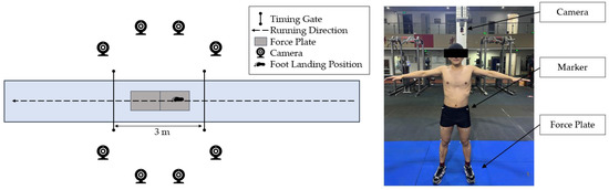 Impact force data was obtained through 900 × 600 mm force plates (Kistler Instrument, Winterhur, Switzerland), sampling at 1000 Hz. Three−dimensional marker trajectories for the standing calibration and running trials were captured through an eight−video camera motion analysis system (Motion Analysis Inc., Santa Rosa, CA, USA), sampling at 200 Hz, which was considered the non−invasive gold standard of motion analysis and is widely used in biomechanical research [43,44,45]. The running speed was recorded using timing gates (Brower Timing Systems, Draper, UT, USA) located at both sides of the force plates with a spacing of 3 m (Figure 2).