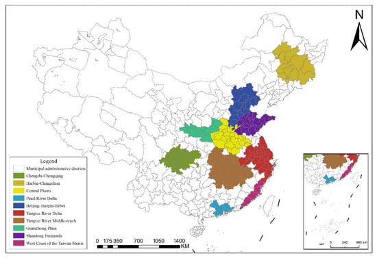 China has a large number of UAs with different dominant levels, and most of them are in the cultivation period. The agglomeration and radiation capacity of central cities is limited. Therefore, we selected ten UAs with relatively mature development in China as the research object. Excluding some cities with serious data loss, we covered a total of 161 Prefecture-Level cities, including the east, northeast, central and western regions on the spatial scale. The specific scope of the UA is determined according to the approval documents of the relevant UA planning. For example, the samples of the Yangtze River Middle-reach UA and Chengdu-Chongqing UA come from the Yangtze River Middle-reach UA Development Plan in April 2015 and the Chengdu-Chongqing UA Development Plan in March 2016, respectively. Considering the availability and integrity of data, 2004–2019 is selected as the time scale. The locations of the study area are demonstrated in Figure 2.