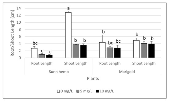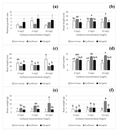 3.1. Toxicity of Carbaryl on Sunn Hemp, Sunflower, and Marigold