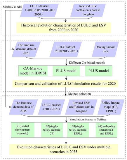 The flowchart of the methodology of this study is shown in Figure 1. The LULC dataset, driving factors data, and ESV coefficients data provided the basis for analysis. In the first part of the research process, we selected the LULC data from 2000, 2005, 2010, 2015, and 2020 to analyze the historical evolution characteristics of LULC. Besides, in the process of LULC-based ESV evaluation, we revised the ESV coefficient of Tongliao. In the second part, we simulated LULC in 2020 using the CA-Markov, FLUS and PLUS models, respectively. Then, we compared and verified the simulation results of the three models according to the real LULC situation of Tongliao in 2020 and selected the most advantageous model. Finally, in the third part, the model chosen in the second part was used for future LULC and we analyzed the evolution characteristics of LULC and ESV under multiple scenarios in 2035. Four simulation scenarios were set up in this study according to the policy impact of the CF and EPRL.