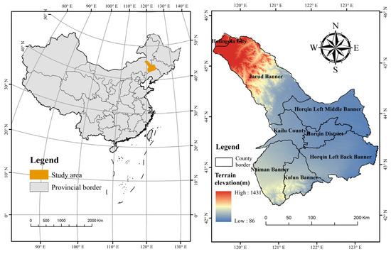 Tongliao (42°15′~45°59′ N, 119°14′~123°43′ E) is located in the eastern part of Inner Mongolia, which is the hinterland of Horqin Sandy Land (Figure 2). The terrain in the south and north of Tongliao is high, while the terrain in the middle is low and flat, and the whole city is saddle-shaped. Tongliao has a total area of 58,800 square kilometers. There are famous grasslands, forests and deserts in the city, with various land types and broad development space. Tongliao has a superior geographical location and is an important strategic node for China to implement the “the belt and road initiative” and for Inner Mongolia to promote its opening to the north. In addition, Tongliao is not only a major agricultural area but also an important animal husbandry area, with obvious characteristics of interlaced agriculture and animal husbandry. In recent years, due to high agricultural income, farmers reclaim land without permission, which leads to a decrease in grassland area year by year and a continuous increase in cultivated land area, which also aggravates the trend of water shortage in the city. The decline in groundwater level leads to the further aggravation of soil desertification and a fragile ecological environment, so it is urgent to change the form of land use.